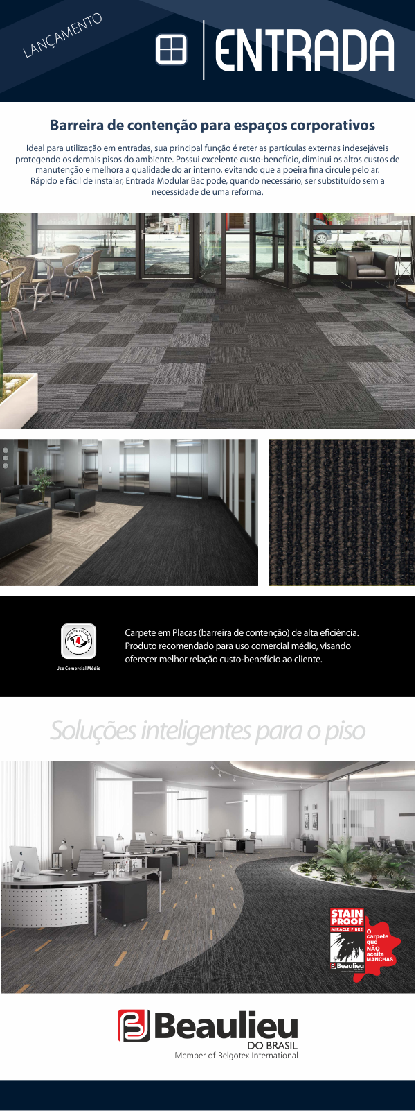 Uma delas é o lançamento do carpete em placas Entrada - barreira de contenção para espaços corporativos.